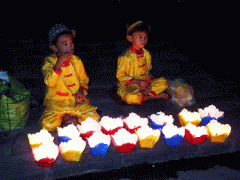 ■トゥボン川をそぞろ歩き。昼は風が心地よいし、夜は対岸の明かりや鐘楼流しを眺めたり、ロマンチックな雰囲気。 ■いつもたくさんの人が往来したり写真を撮っているアン・ホイ橋にかかるオブジェ。台風の後はなくなっていました。 ■川岸のランプやカラフルな家がかわいい。