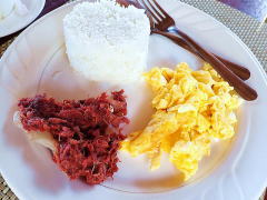| ■海を望むレストランで朝食。料理が出てくるまで30分くらい待ちます。いつも待たされるしメニューは少なく味も普通だけど、海を眺めながら食べる朝ごはんはサイコー! |
