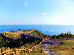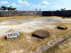■石垣だけが残されています。 ■ここに建物があったらしい。 ■城壁の上から。残波岬まで見えました。