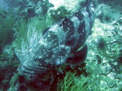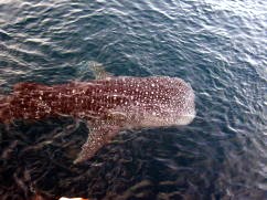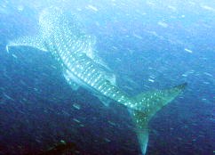 ■ジンベエザメに遭える、タオ島1の人気ポイント。初日の1本目、安全停止に入った頃にほかのチームからジンベエがいるとの情報が!行ってみると、うわぁー夢にまで見たジンベエが!ところがなんとここでカメラトラブル!ジンベエの顔に大接近したのに、シャッターが 切れない!どうもハウジングとカメラの接触が悪いらしい。シャッターが切れるようになったのは、ジンベエが去るころでした。ショック(。_。;) ![]()
