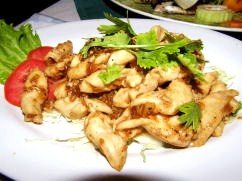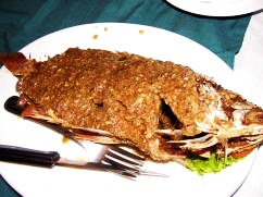 | ■レッドスナッパーのフライWithガーリックソース(350B)、グリルドチキン(100B)、グリルドスクウィイッド(200B)、ビール・赤ワインを飲んで2人で1,070B。 |